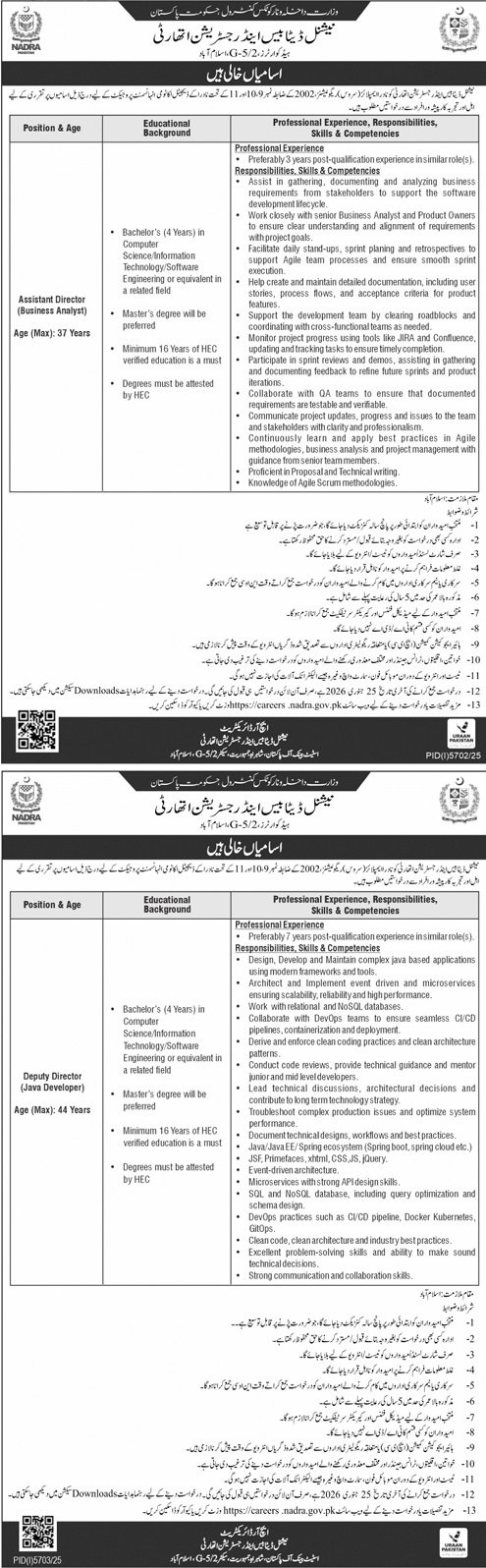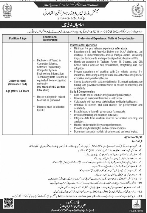 National Datebase And Registration Authority Islamabad Jobs announce the Contract career opportunities for the post of See Below Ad in Federal, Islamabad for the fresh and experienced candidates on Contract basis who have Check Advertisement degree. Posted date of this post is 11/01/2026 and the last date is 01/02/2026. if you are eligible for this job apply before due date.