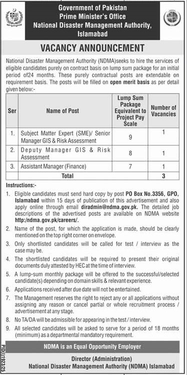 National Disaster Management Authority (NDMA) seeks to hire the services of eligible candidates purely on contract basis on lump sum package for an initial period of 24 months. These purely contractual posts are extendable on requirement basis. The posts will be filled on open merit basis as per detail given below:-