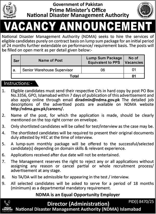 National Disaster Management Authority Jobs 2026 announce the Contract career opportunities for the post of See Below Ad in Federal, Islamabad for the fresh and experienced candidates on Contract basis who have Check Advertisement degree. Posted date of this post is 18/04/2026 and the last date is 25/04/2026. if you are eligible for this job apply before due date.