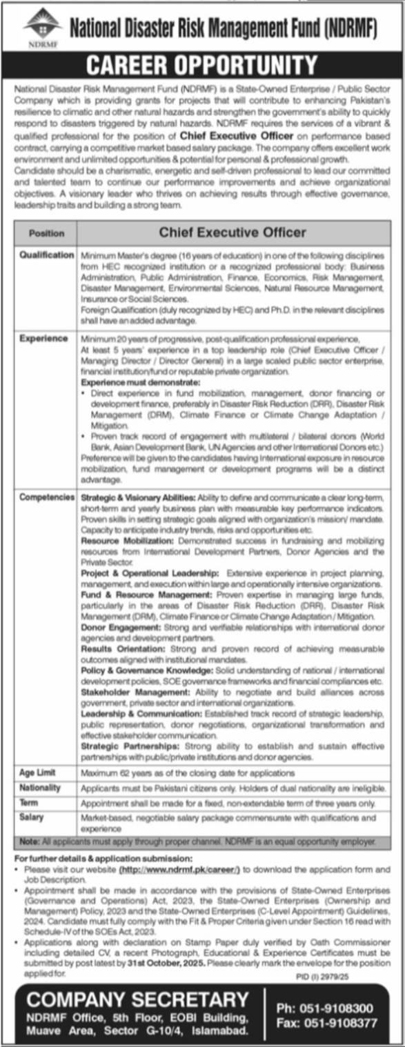 National Disaster Risk Management Fund (NDRMF) is a State-Owned Enterprise / Public Sector Company which is providing grants for projects that will contribute to enhancing Pakistan's resilience to climatic and other natural hazards and strengthen the government's ability to quickly respond to disasters triggered by natural hazards. NDRMF requires the services of a vibrant & qualified professional for the position of Chief Executive Officer on a performance-based contract, carrying a competitive market-based salary package. The company offers an excellent work environment and unlimited opportunities & potential for personal & professional growth. Candidate should be a charismatic, energetic and self-driven professional to lead our committed and talented team to continue our performance improvements and achieve organizational objectives. A visionary leader who thrives on achieving results through effective governance, leadership traits and building a strong team.