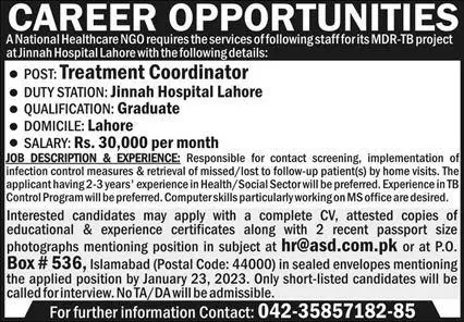 - National Healthcare NGO Lahore, lahore Punjab Pakistan invites applications from eligible candidates for the post of treatment coordinator as per advertisement of January 8, 2023 published in daily Express Newspaper. Educational qualifications required Bachelor etc.