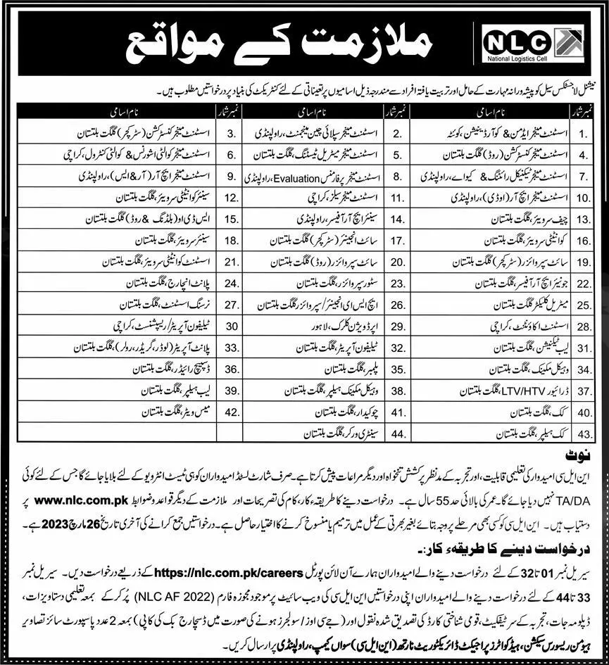- For other vacancies, Application Forms and Procedures are available on the NLC website (www.nlc.com.pk). Applicants can forward Application Forms with the required information and documents before 26th March 2023.