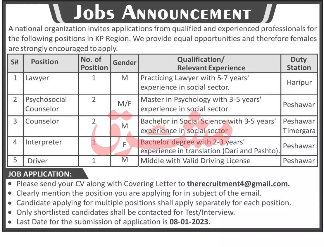 National Organization Peshawar Khyber Pakhtunkhwa Jobs 2023 announce the Contract career opportunities for the post of See Below Ad in Khyber Pakhtunkhwa, Peshawar for the fresh and experienced candidates on Contract basis who have Check Advertisement degree. Posted date of this post is 02/01/2023 and the last date is 08/01/2023. if you are eligible for this job apply before due date.