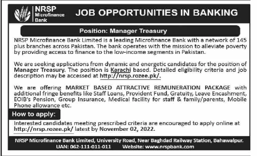 National Rural Support Program NRSP Jobs 2022 announce the Contract career opportunities for the post of See Below Ad in Punjab, Bahawalpur for the fresh and experienced candidates on Contract basis who have Check Advertisement degree. Posted date of this post is 25/10/2022 and the last date is 02/11/2022. if you are eligible for this job apply before due date.