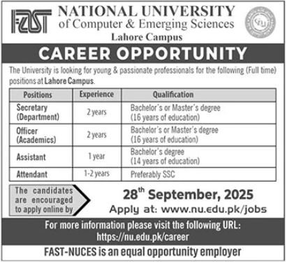 National University Of Computer Lahore Jobs 2025 announce the Contract career opportunities for the post of See Below Ad in Punjab, Lahore for the fresh and experienced candidates on Contract basis who have Check Advertisement degree. Posted date of this post is 14/09/2025 and the last date is 28/09/2025. if you are eligible for this job apply before due date.
