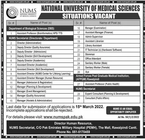 National University of Medical Sciences Nums Jobs announce the Permanent career opportunities for the post of See Below Ad in Pakistan,Rawalpindi for the fresh and experienced candidates on Permanent basis who have Check Advertisement degree. Posted date of this post is 27/02/2022 and the last date is 27/02/2022. if you are eligible for this job apply before due date.