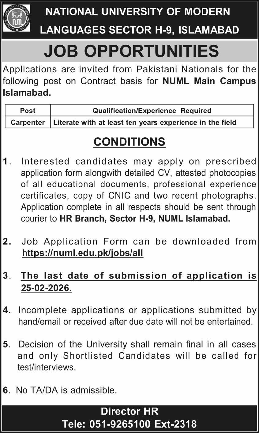 - Interested candidates may apply on prescribed application form alongwith detailed CV, attested photocopies of all educational documents, professional experience certificates, copy of CNIC and two recent photographs. Application complete in all respects should be sent through courier to HR Branch, Sector H-9, NUML Islamabad.