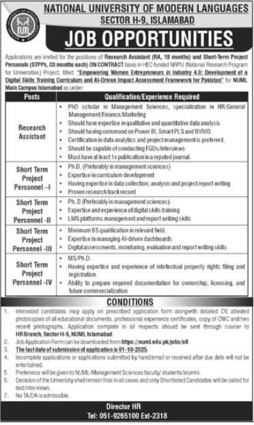 National University Of Modern Languages NUML Islamabad Jobs announce the Contract career opportunities for the post of See Below Ad in Federal, Islamabad for the fresh and experienced candidates on Contract basis who have Check Advertisement degree. Posted date of this post is 17/09/2025 and the last date is 01/10/2025. if you are eligible for this job apply before due date.