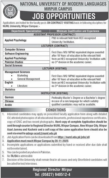 National University Of Modern Languages NUML Jobs 2025 announce the Contract career opportunities for the post of See Below Ad in Azad Jammu Kashmir, Mirpur for the fresh and experienced candidates on Contract basis who have Check Advertisement degree. Posted date of this post is 14/11/2025 and the last date is 28/11/2025. if you are eligible for this job apply before due date.