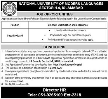 National University Of Modern Languages NUML Jobs 2026 announce the Contract career opportunities for the post of See Below Ad in Federal, Islamabad for the fresh and experienced candidates on Contract basis who have Check Advertisement degree. Posted date of this post is 18/02/2026 and the last date is 04/03/2026. if you are eligible for this job apply before due date.