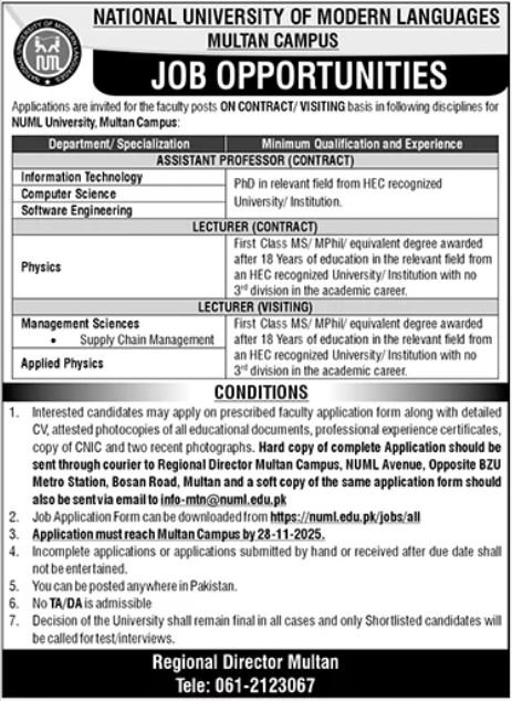 National University Of Modern Languages NUML Multan Jobs announce the Contract career opportunities for the post of See Below Ad in Punjab, Multan for the fresh and experienced candidates on Contract basis who have Check Advertisement degree. Posted date of this post is 14/11/2025 and the last date is 28/11/2025. if you are eligible for this job apply before due date.