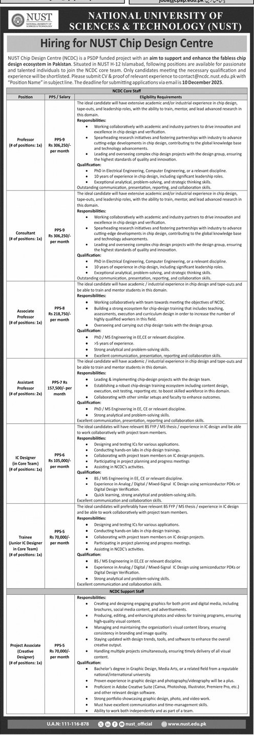 National University of Sciences & Technology NUST Jobs announce the Contract career opportunities for the post of See Below Ad in Federal, Islamabad for the fresh and experienced candidates on Contract basis who have Check Advertisement degree. Posted date of this post is 23/11/2025 and the last date is 10/12/2025. if you are eligible for this job apply before due date.