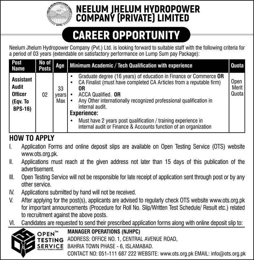 - Neelum Jhelum Hydropower Company Islamabad, islamabad Islamabad Pakistan invites applications from eligible candidates for the post of assistant audit officer as per advertisement of July 23, 2023 published in daily Express Newspaper. Candidates with Master, Bachelor and ACCA etc. educational background will be preferred.