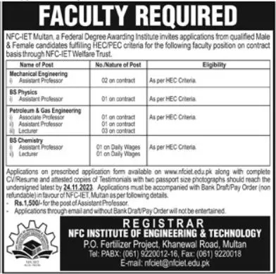 NFC Institute of Engineering & Technology Multan Jobs 2023 announce the Contract career opportunities for the post of See Below Ad in Punjab, Multan for the fresh and experienced candidates on Contract basis who have Check Advertisement degree. Posted date of this post is 09/11/2023 and the last date is 24/11/2023. if you are eligible for this job apply before due date.