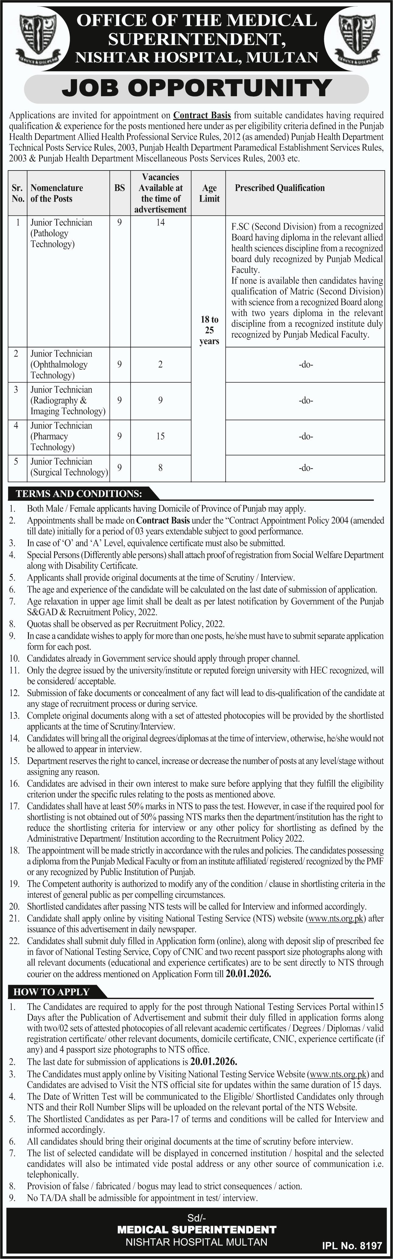 Nishat Hospital Multan Punjab Jobs 2026 announce the Contract career opportunities for the post of See Below Ad in Punjab, Multan for the fresh and experienced candidates on Contract basis who have Check Advertisement degree. Posted date of this post is 02/01/2026 and the last date is 20/01/2026. if you are eligible for this job apply before due date.