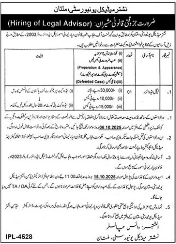 - Applications along with 2 attested copies of academic certificates, bar council registration, experience certificates, and latest resume should be submitted to the office of the Registrar, Nishtar Medical University, Multan by Monday, October 06, 2025, at 10:00 AM. Applications received after the due date will not be accepted.