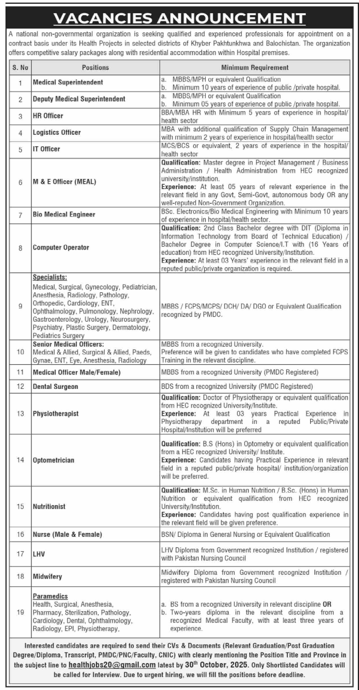 Interested candidates are required to send their CVs & Documents (Relevant Graduation/Post Graduation Degree/Diploma, Transcript, PMDC/PNC/Faculty, CNIC) with clearly mentioning the Position Title and Province in the subject line to healthjobs20@gmail.com latest by 30th October, 2025. Only Shortlisted Candidates will be called for Interview. Due to urgent hiring, we will fill the positions before deadline.