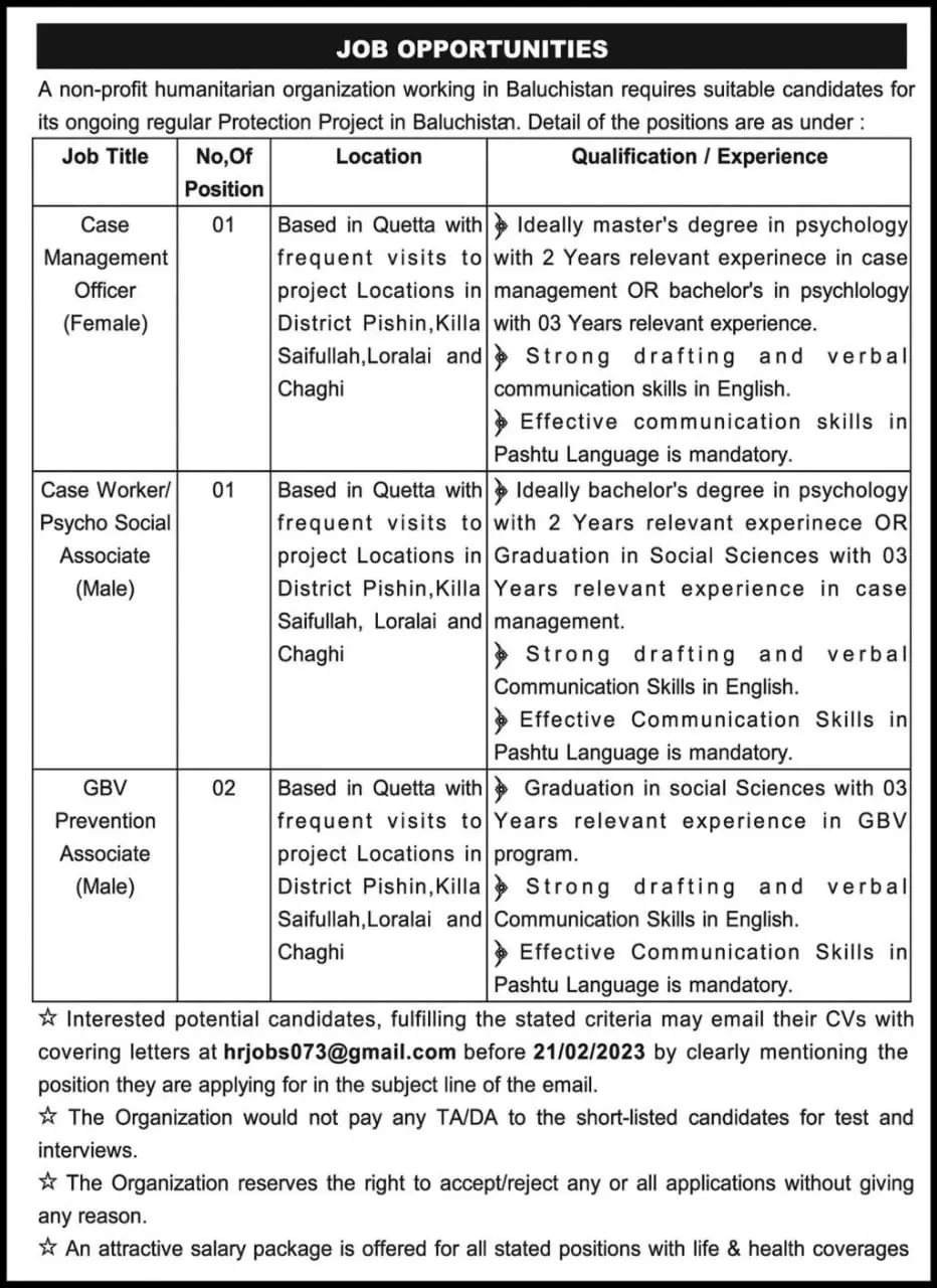 Non profit Humanitarian Organization Balochistan Jobs 2023 announce the Contract career opportunities for the post of See Below Ad in Chagai, Killa Saifullah, Loralai, Pishin, Quetta for the fresh and experienced candidates on Contract basis who have Check Advertisement degree. Posted date of this post is 14/02/2023 and the last date is 21/02/2023. if you are eligible for this job apply before due date.