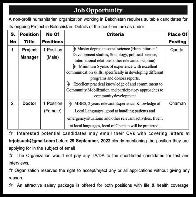 - Vacant posts including female doctor, doctor and project manager are announced in Non Governmental Organization NGO Quetta, chaman Balochistan Pakistan as per 23 September 2022 advertisement in daily Express Newspaper.