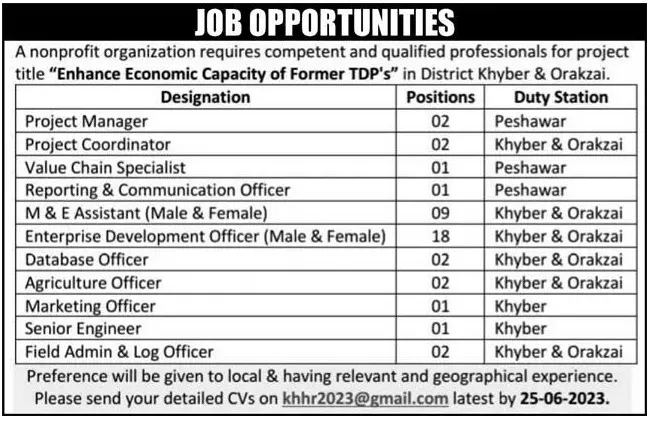 - Please send your detailed CVs on khhr2023@gmail.com latest by 25-06-2023. 02 Khyber & Orakzai