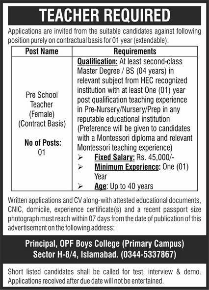 OPF Boys College Islamabad Jobs 2026 For Pre School Teacher announce the Contract career opportunities for the post of See Below Ad in Federal, Islamabad for the fresh and experienced candidates on Contract basis who have Check Advertisement degree. Posted date of this post is 25/12/2025 and the last date is 01/01/2026. if you are eligible for this job apply before due date.