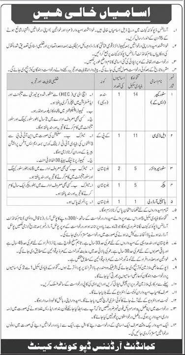 Ordnance Depot Quetta Cantt has the following vacancies. Interested candidates (male and female) should submit their applications within 15 days of the advertisement's publication.