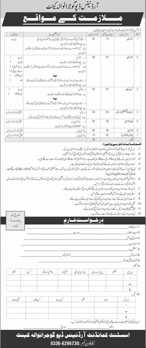 Vacancies are available in Ordnance Depot Gujranwala Cantt for the following posts: