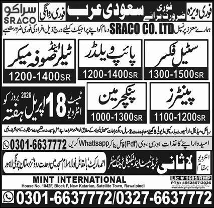 Painter & Pipe Welder Jobs 2026 In Saudi Arabia announce the Contract career opportunities for the post of See Below Ad in Saudi Arabia for the fresh and experienced candidates on Contract basis who have Check Advertisement degree. Posted date of this post is 11/04/2026 and the last date is 18/04/2026. if you are eligible for this job apply before due date.