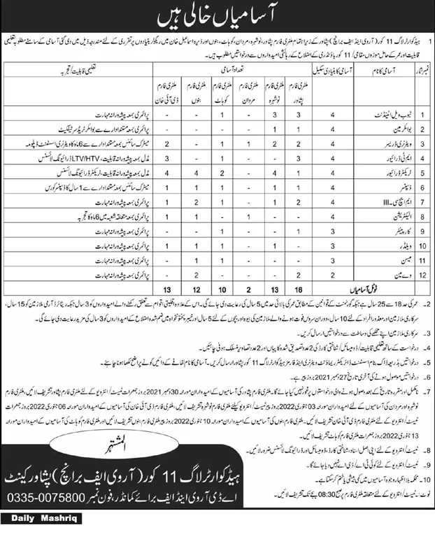 Latest Jobs in Pakistan Army Log-11 Core Peshawar Kpk announce the Adhoc career opportunities for the post of See Below Ad in Pakistan,Peshawar for the fresh and experienced candidates on Adhoc basis who have Check Advertisement degree. Posted date of this post is 14/12/2021 and the last date is 30/12/2021. if you are eligible for this job apply before due date.