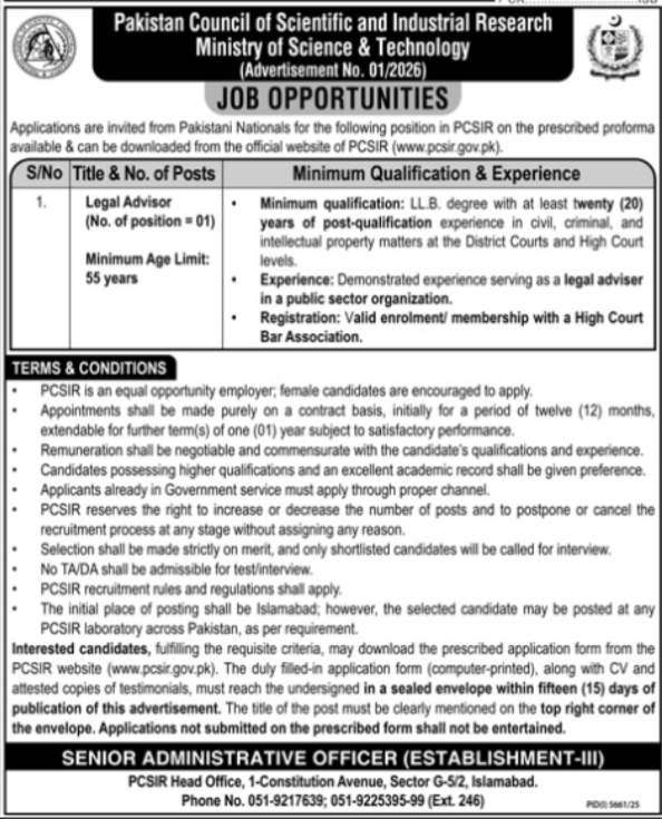 Pakistan Council of Scientific and Industrial Research Jobs announce the Contract career opportunities for the post of See Below Ad in Federal, Islamabad for the fresh and experienced candidates on Contract basis who have Check Advertisement degree. Posted date of this post is 11/01/2026 and the last date is 26/01/2026. if you are eligible for this job apply before due date.