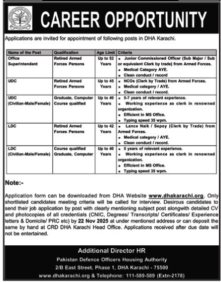 Pakistan Defence Officers Housing Authority Karachi Jobs announce the Contract career opportunities for the post of See Below Ad in Sindh, Karachi for the fresh and experienced candidates on Contract basis who have Check Advertisement degree. Posted date of this post is 13/11/2025 and the last date is 22/11/2025. if you are eligible for this job apply before due date.