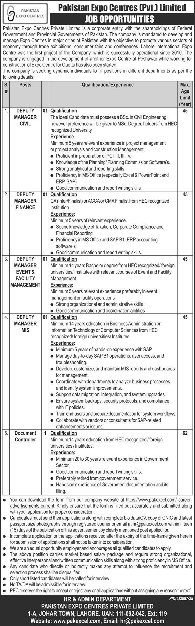 Pakistan Expo Centres Lahore Jobs 2026 For Deputy Managers announce the Contract career opportunities for the post of See Below Ad in Punjab, Lahore for the fresh and experienced candidates on Contract basis who have Check Advertisement degree. Posted date of this post is 24/04/2026 and the last date is 08/05/2026. if you are eligible for this job apply before due date.