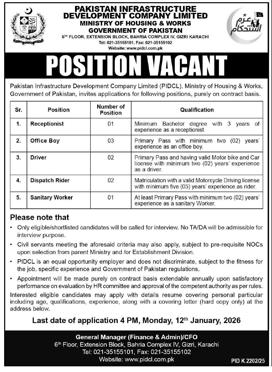 Pakistan Infrastructure Development Company PIDCL Jobs 2026 announce the Contract career opportunities for the post of See Below Ad in Sindh, Karachi for the fresh and experienced candidates on Contract basis who have Check Advertisement degree. Posted date of this post is 26/12/2025 and the last date is 12/01/2026. if you are eligible for this job apply before due date.