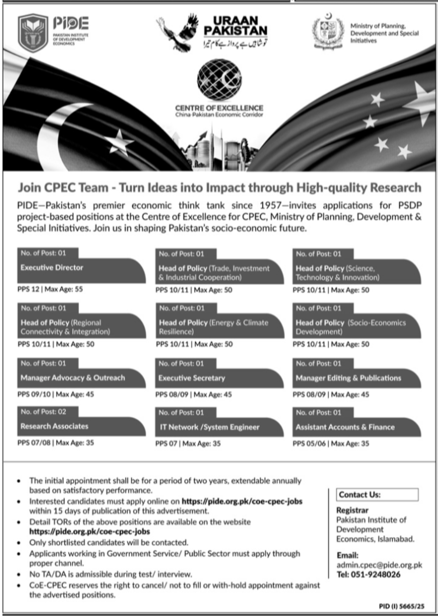 PIDE-Pakistan's premier economic think tank since 1957-invites applications for PSDP project-based positions at the Centre of Excellence for CPEC, Ministry of Planning, Development & Special Initiatives. Join us in shaping Pakistan's socio-economic future.
