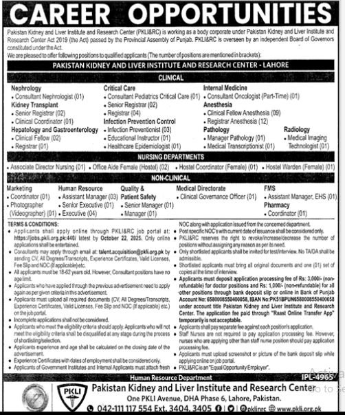 Pakistan Kidney & Liver Institute & Research Centre PKLI Job announce the Contract career opportunities for the post of See Below Ad in Punjab, Lahore for the fresh and experienced candidates on Contract basis who have Check Advertisement degree. Posted date of this post is 05/10/2025 and the last date is 22/10/2025. if you are eligible for this job apply before due date.