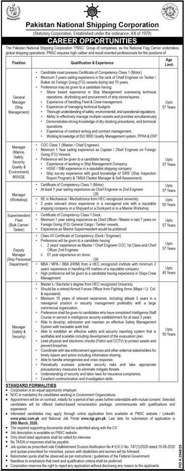 Pakistan National Shipping Corporation Jobs 2026 announce the Contract career opportunities for the post of See Below Ad in Sindh, Karachi for the fresh and experienced candidates on Contract basis who have Check Advertisement degree. Posted date of this post is 08/03/2026 and the last date is 29/03/2026. if you are eligible for this job apply before due date.
