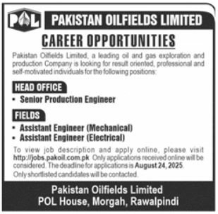 Pakistan Oilfields Limited POL Rawalpindi Jobs 2025 announce the Contract career opportunities for the post of See Below Ad in Punjab, Rawalpindi for the fresh and experienced candidates on Contract basis who have Check Advertisement degree. Posted date of this post is 17/08/2025 and the last date is 24/08/2025. if you are eligible for this job apply before due date.