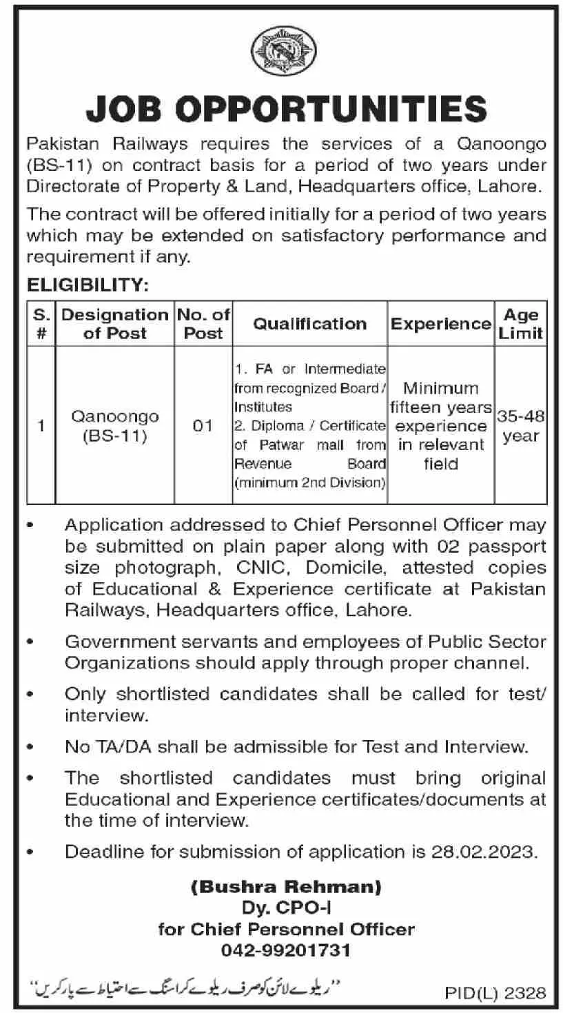 - Pakistan Railways is looking to hire highly dynamic, qualified, and motivated professionals for the Directorate of Property & Land, Headquarters Office Lahore. This appointment will be made purely on a contract basis.