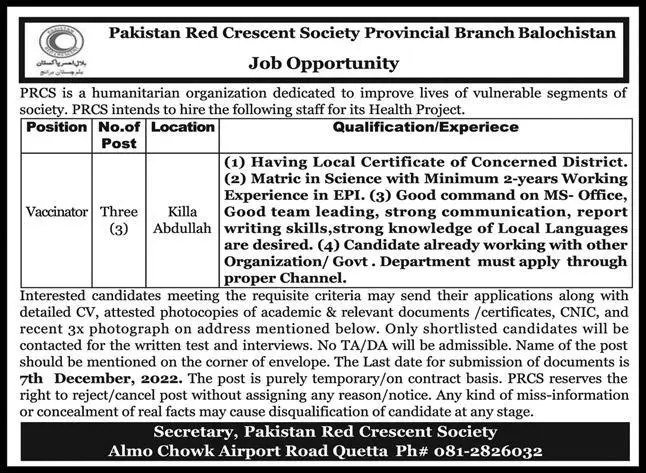 Pakistan Red Crescent Society Balochistan Jobs 2022 announce the Contract career opportunities for the post of See Below Ad in Balochistan, Killa Abdullah for the fresh and experienced candidates on Contract basis who have Check Advertisement degree. Posted date of this post is 01/12/2022 and the last date is 07/12/2022. if you are eligible for this job apply before due date.