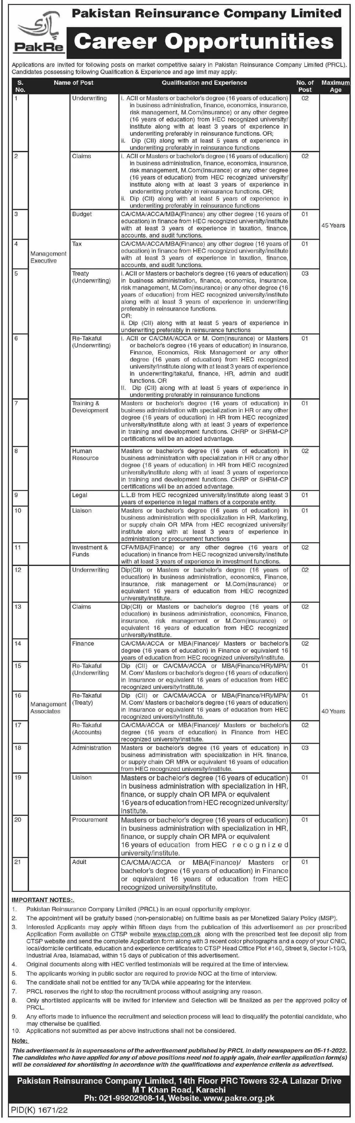 - Pakistan Reinsurance Company Limited PRCL Karachi is looking to hire the services of Executive Management and Management Associate. These Posts are required for Underwriting, Claims, Badget, Tax, Training & Development, Human Resources, Legal, Liaison, Investment, Finance, and Administration.