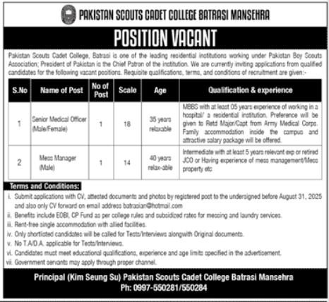 Pakistan Scouts Cadet College Mansehra Jobs 2025 announce the Contract career opportunities for the post of See Below Ad in Khyber Pakhtunkhwa, Mansehra for the fresh and experienced candidates on Contract basis who have Check Advertisement degree. Posted date of this post is 21/08/2025 and the last date is 31/08/2025. if you are eligible for this job apply before due date.