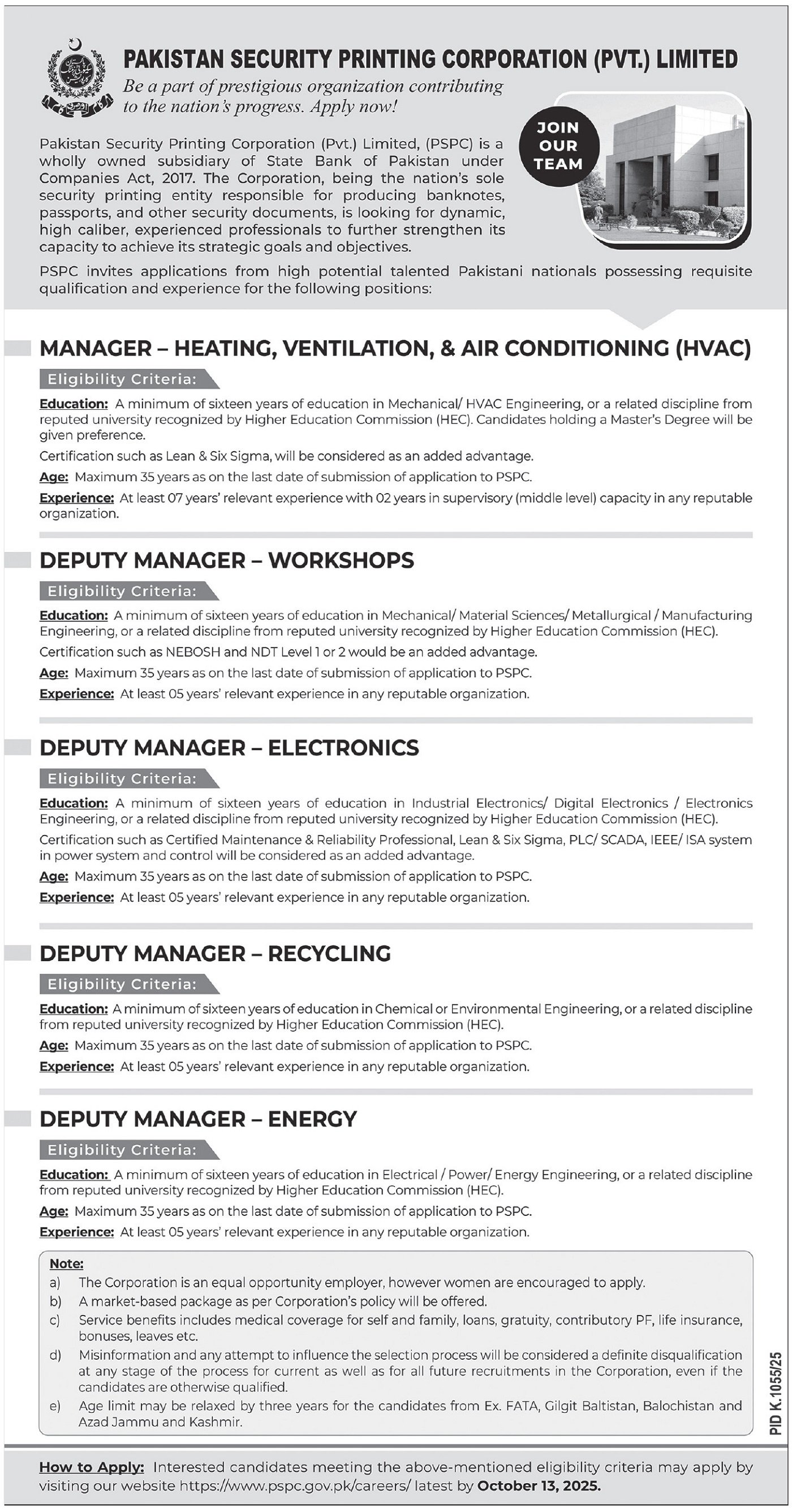 Pakistan Security Printing Corporation (Pvt.) Limited, (PSPC) is a wholly owned subsidiary of State Bank of Pakistan under Companies Act, 2017. The Corporation, being the nation's sole security printing entity responsible for producing banknotes, passports, and other security documents, is looking for dynamic, high caliber, experienced professionals to further strengthen its capacity to achieve its strategic goals and objectives.