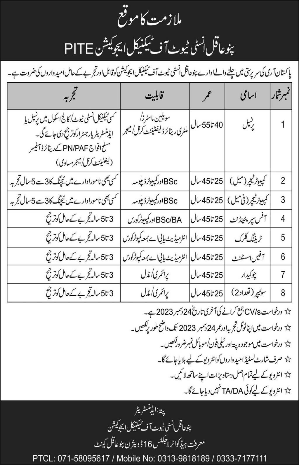 Pano Aqil Institute of Technical Education PITE Jobs 2023 announce the Contract career opportunities for the post of See Below Ad in Sindh, Karachi for the fresh and experienced candidates on Contract basis who have Check Advertisement degree. Posted date of this post is 17/12/2023 and the last date is 24/12/2023. if you are eligible for this job apply before due date.