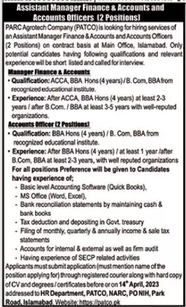 PARC Agrotech Company PATCO Islamabad Jobs 2023 announce the Contract career opportunities for the post of See Below Ad in Federal, Islamabad for the fresh and experienced candidates on Contract basis who have Check Advertisement degree. Posted date of this post is 04/04/2023 and the last date is 14/04/2023. if you are eligible for this job apply before due date.
