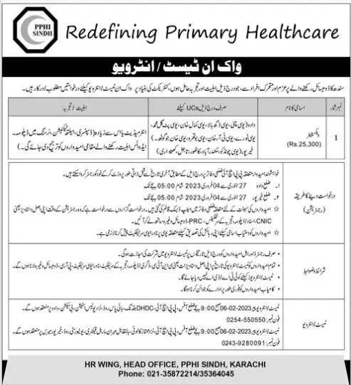 people's primary healthcare initiative jobs Interview 2023 announce the Contract career opportunities for the post of See Below Ad in Sindh, Karachi for the fresh and experienced candidates on Contract basis who have Check Advertisement degree. Posted date of this post is 27/01/2023 and the last date is 06/02/2023. if you are eligible for this job apply before due date.