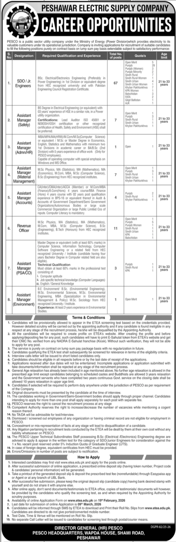 Peshawar Electric Supply Company PESCO Jobs 2026 announce the Contract career opportunities for the post of See Below Ad in Khyber Pakhtunkhwa, Peshawar for the fresh and experienced candidates on Contract basis who have Check Advertisement degree. Posted date of this post is 18/02/2026 and the last date is 09/03/2026. if you are eligible for this job apply before due date.