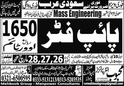 Pipe Fitter Jobs in Saudia Arabia 2026 announce the Contract career opportunities for the post of See Below Ad in Saudi Arabia for the fresh and experienced candidates on Contract basis who have Check Advertisement degree. Posted date of this post is 25/03/2026 and the last date is 28/03/2026. if you are eligible for this job apply before due date.