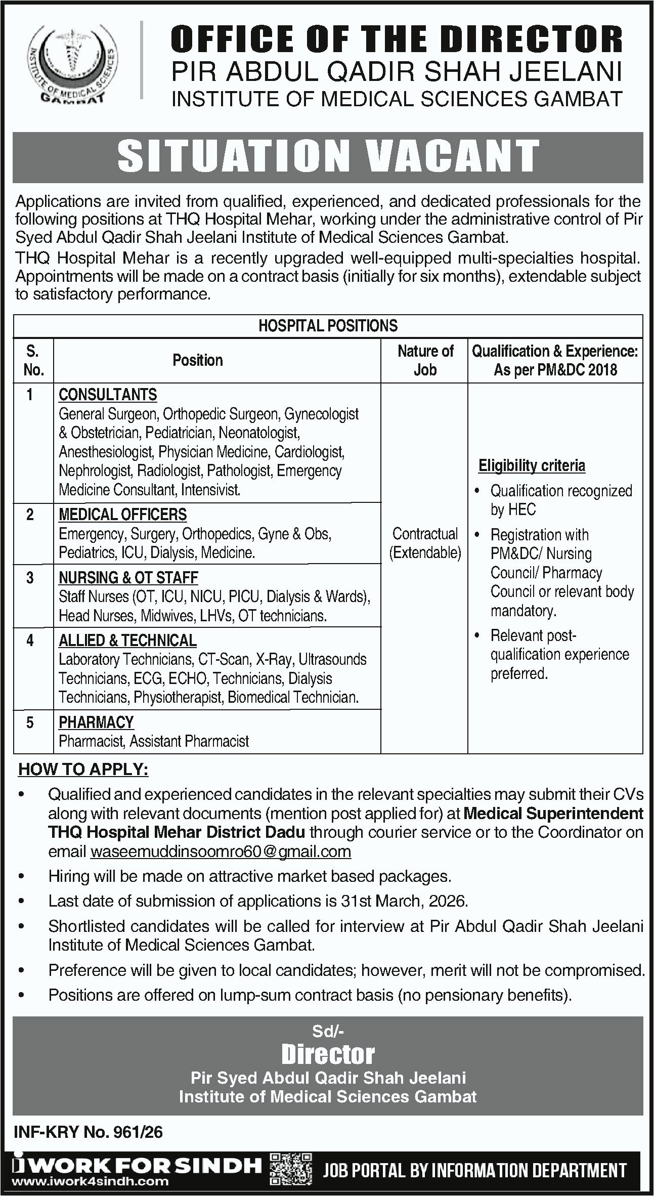 Pir Abdul Qadir Shah Jeelani Institute Of Medical Jobs 2026 announce the Contract career opportunities for the post of See Below Ad in Sindh, Jamshoro for the fresh and experienced candidates on Contract basis who have Check Advertisement degree. Posted date of this post is 10/03/2026 and the last date is 31/03/2026. if you are eligible for this job apply before due date.