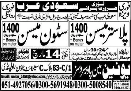Plaster Mason & Stone Mason Jobs in Saudi Arabia 2023 announce the Contract career opportunities for the post of See Below Ad in Saudi Arabia for the fresh and experienced candidates on Contract basis who have Check Advertisement degree. Posted date of this post is 13/03/2023 and the last date is 14/03/2023. if you are eligible for this job apply before due date.