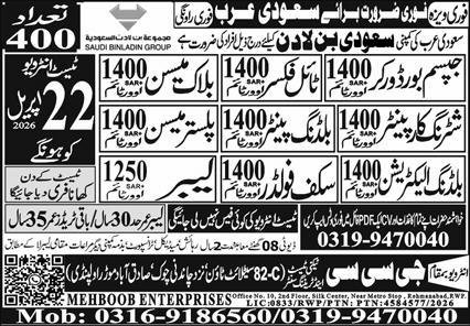 Plaster Mason & Tile Fixer Jobs 2026 In Saudi Arabia announce the Contract career opportunities for the post of See Below Ad in Saudi Arabia for the fresh and experienced candidates on Contract basis who have Check Advertisement degree. Posted date of this post is 21/04/2026 and the last date is 22/04/2026. if you are eligible for this job apply before due date.
